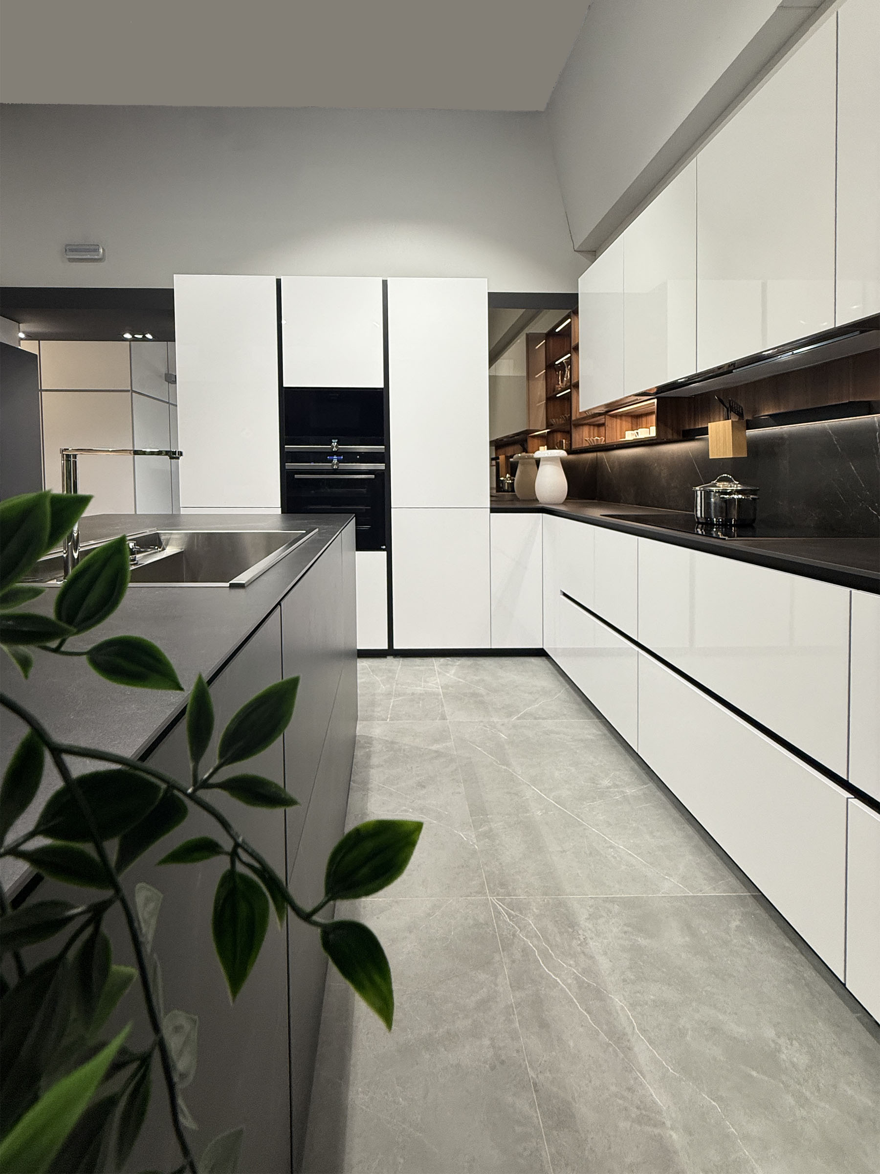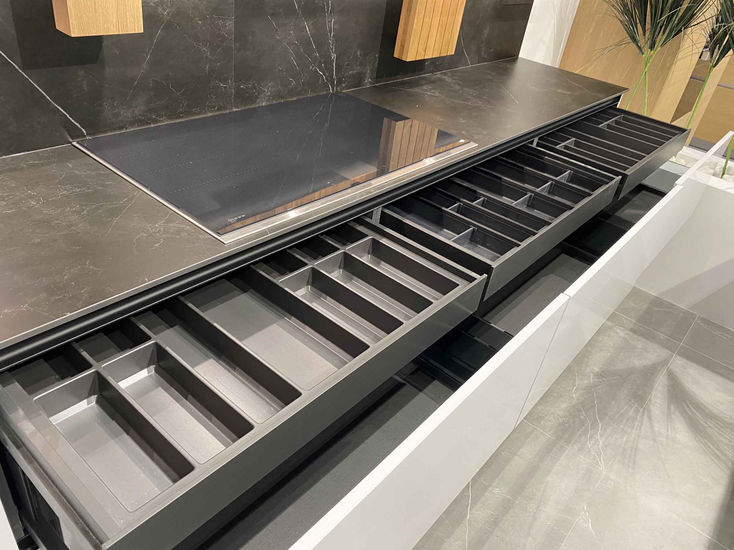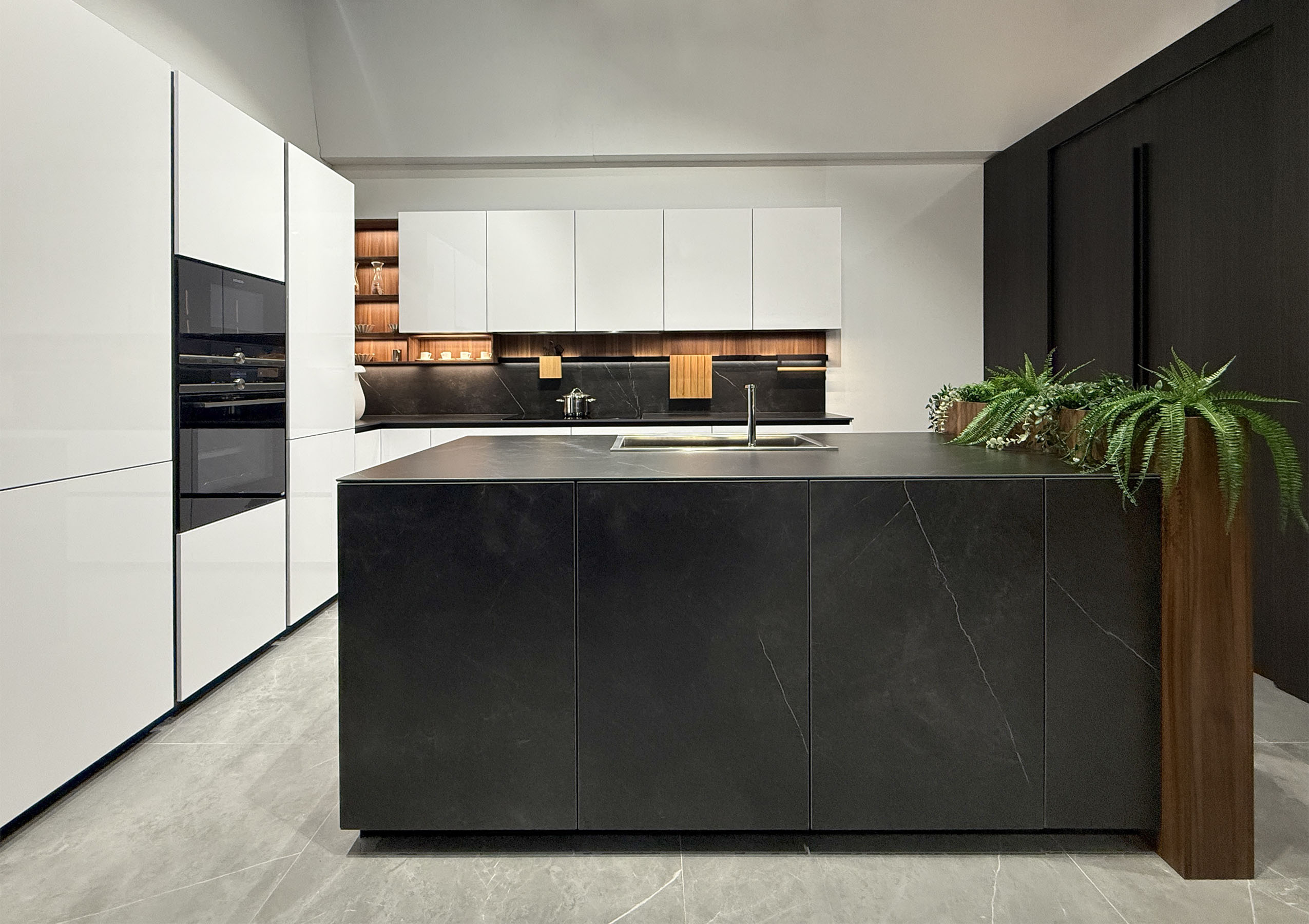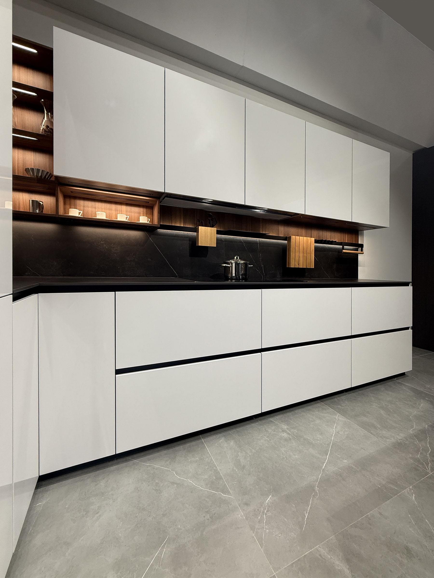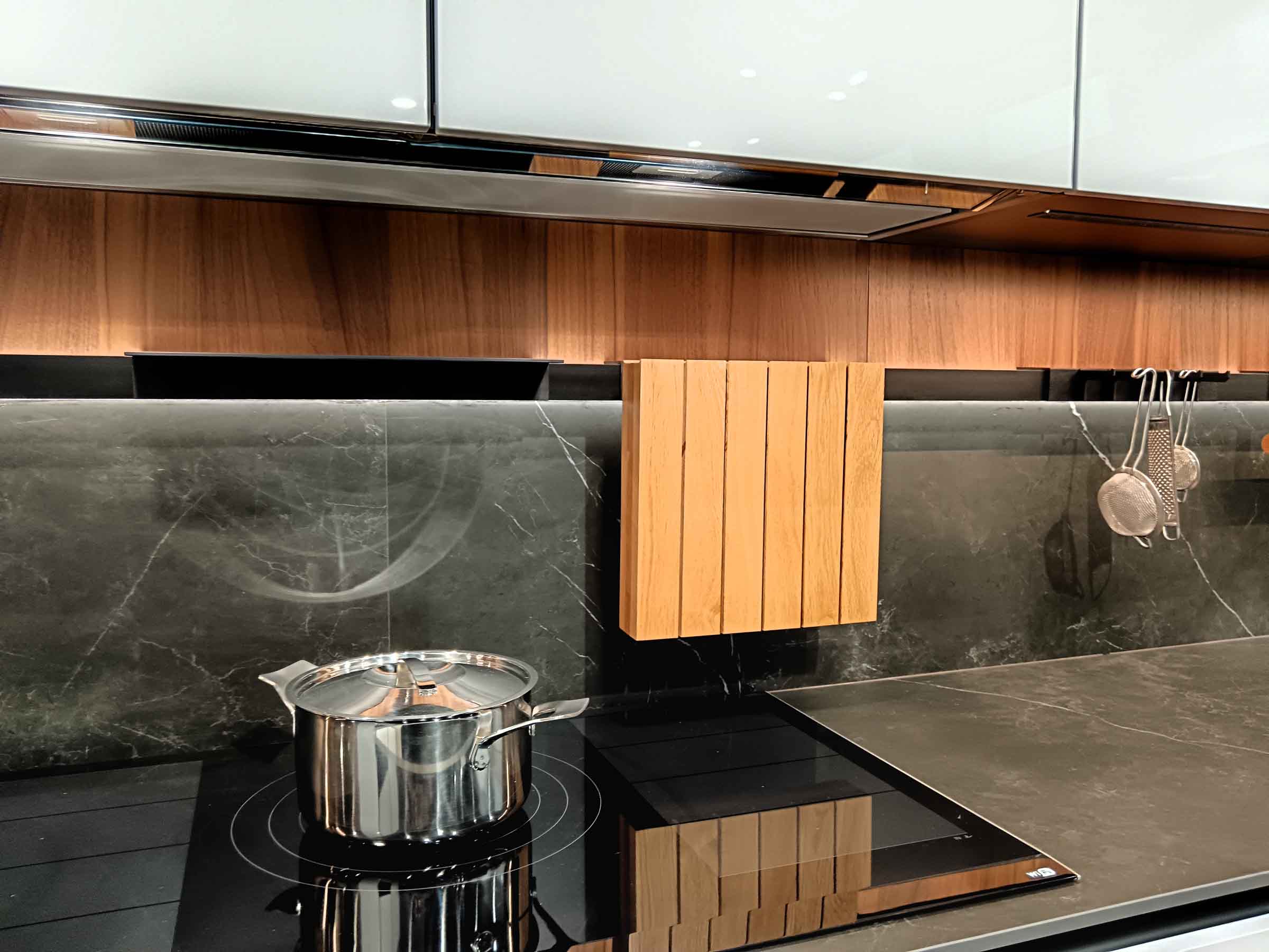 - Sistema DOMO en aluminio lacado negro con iluminación integrada completamente equipado con accesorios en aluminio negro y madera de nogal para el espacio sobre la encimera.