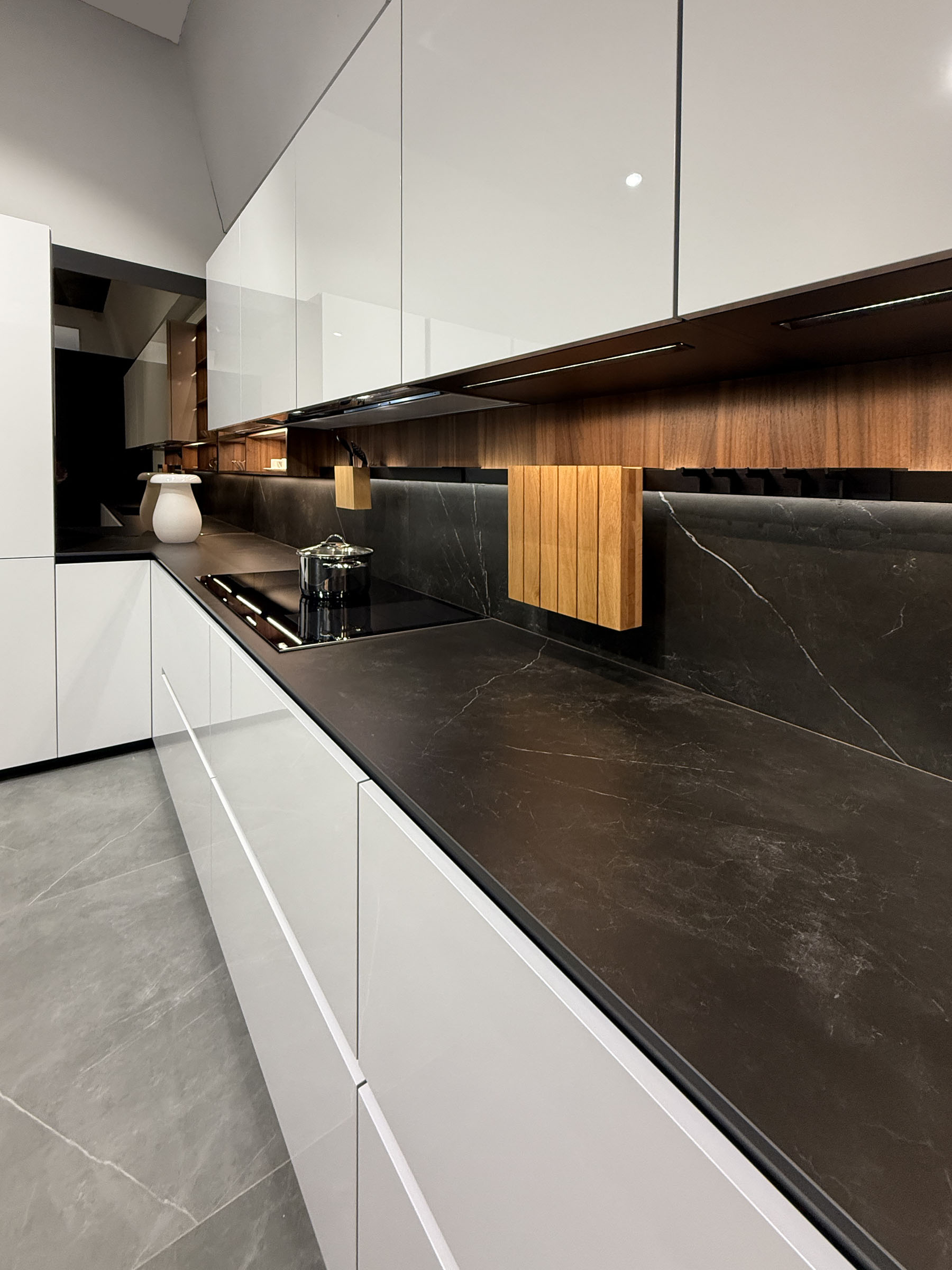 La espectacular superficie MDi de piedra sinterizada color Storm negro de Inalco se repite también en la encimera de la zona de cocción, plegándose hasta alcanzar las estanterías de los muebles colgados, formando otra envolvente de aspecto pétreo que unifica todo el conjunto.