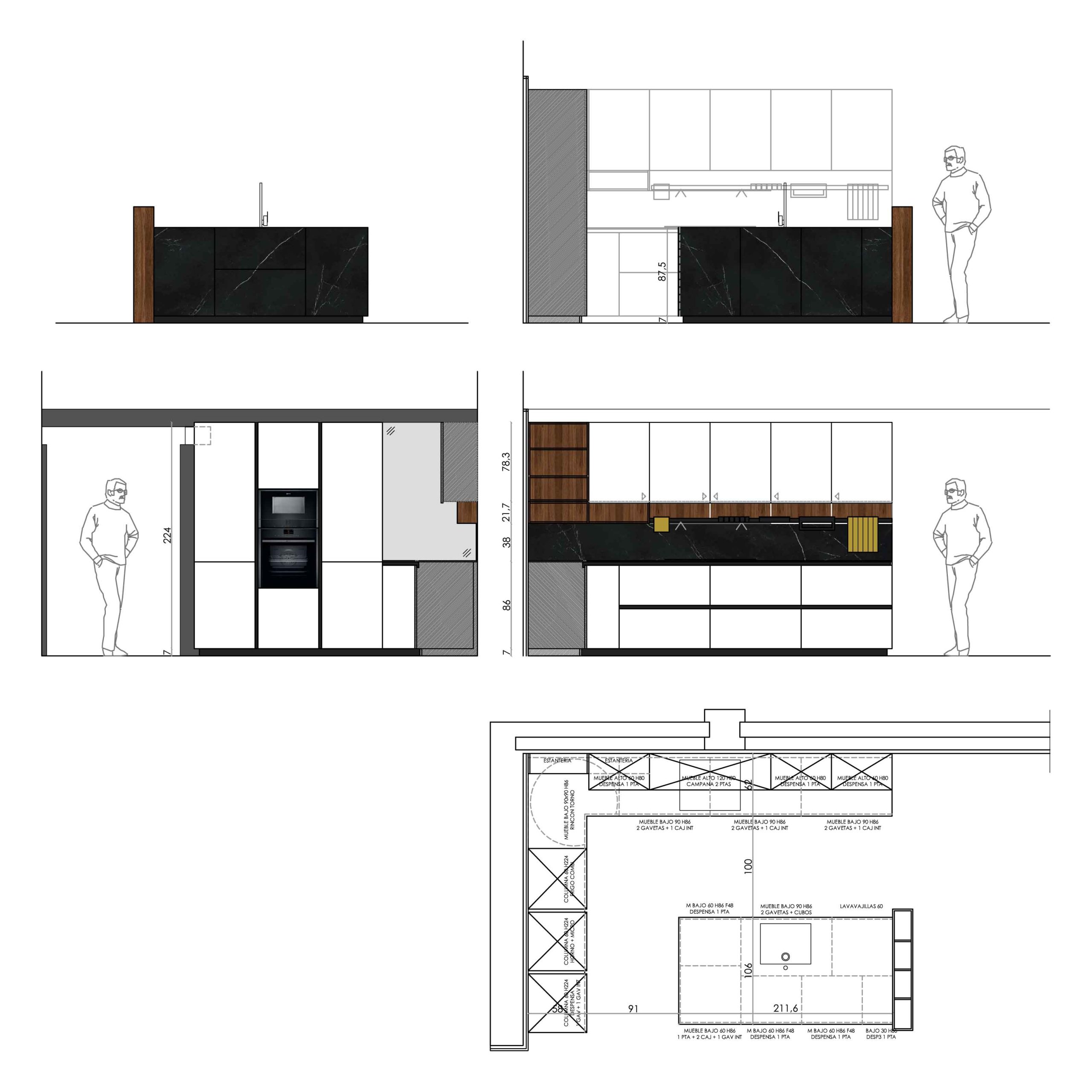 - Muebles en isla de altura 86,5cm + 7cm de zócalo, realizados en material de piedra sinterizada color storm negro con costados biselados en el mismo material.