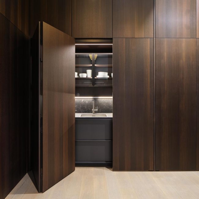 Sistema de puertas plegables y escamoteables que nos permite ocultar la cocina completamente.