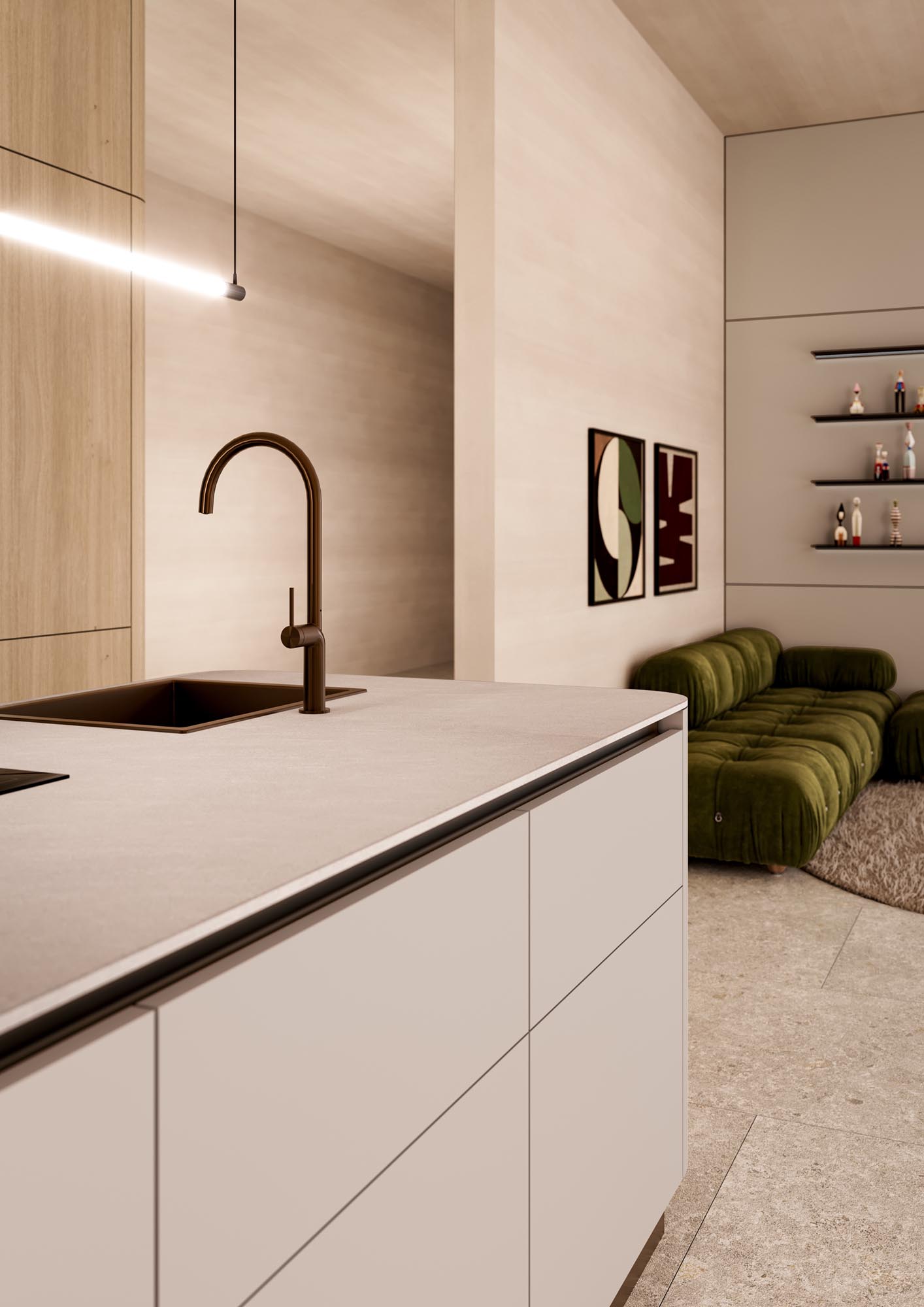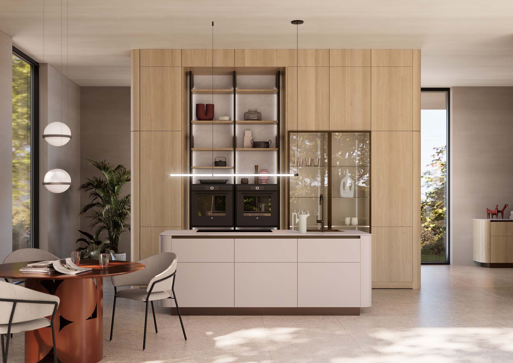 El programa TOPOS en madera y CLASSIC FS en laca mate se utiliza en esta ocasión con costados curvos para ofrecer un carácter más orgánico y acogedor al espacio de la cocina.