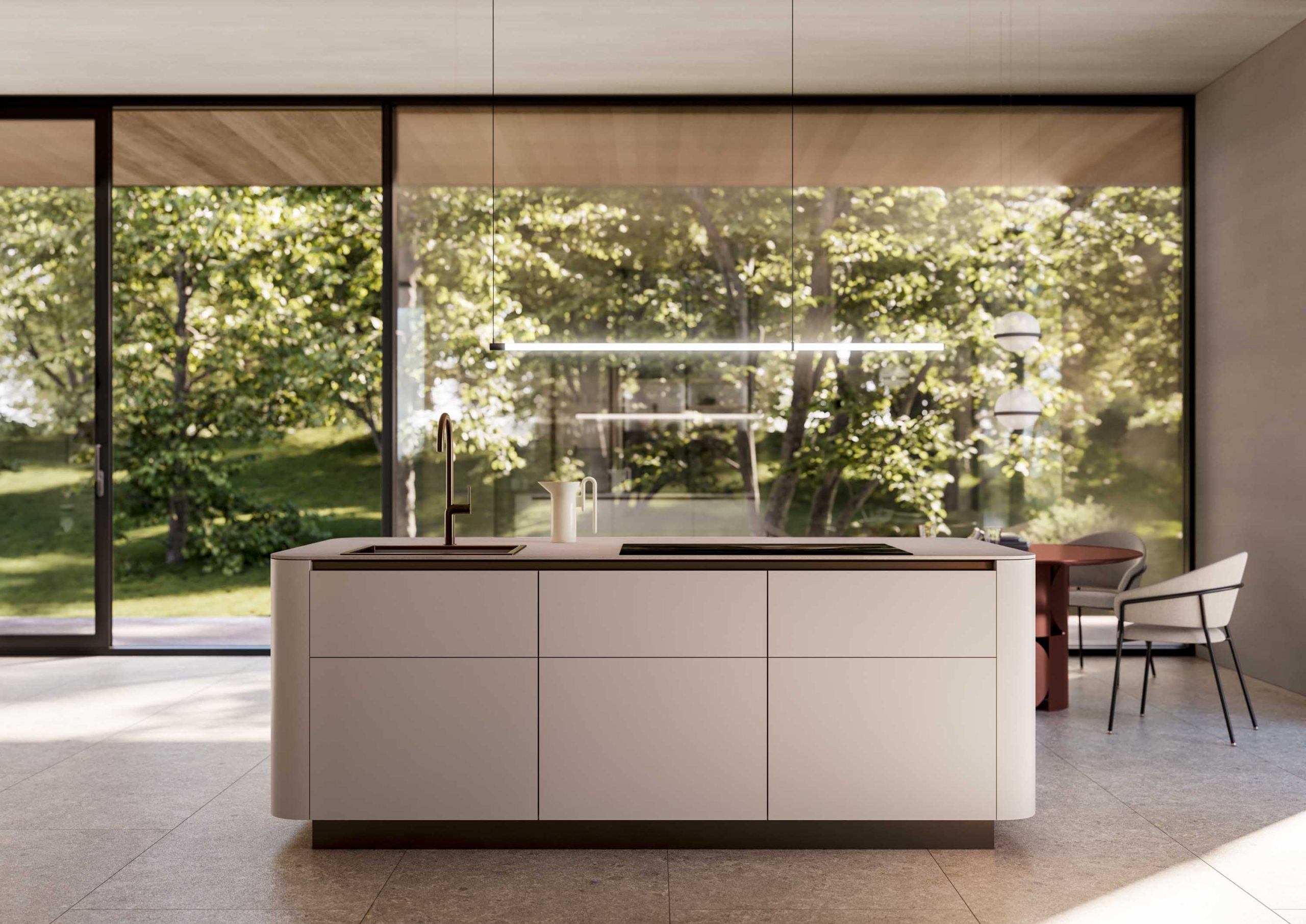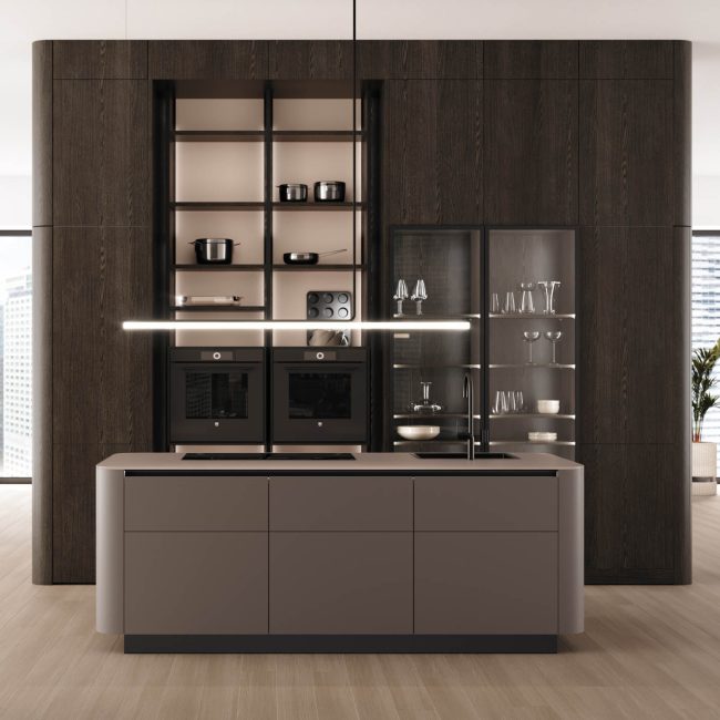 Los paneles laterales redondeados, en combinación con encimeras que guardan el mismo radio de curvatura, permiten unas transiciones suaves y acentúan el carácter fluido y dinámico de las cocinas y de los salones modernos, creando una sensación espacial totalmente nueva que transmite amplitud.